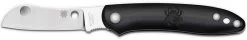 The illustrated Spyderco Knife is the Spyderco Roadie Knife that features a 2.09 inch non locking sheepfoot blade made of N690Co stainless steel, .112 inch thick. The blade of this Spyderco knife has a flat grind, a notched choil and spine for secure grip, and Double Dent feature for easy two hand opening. The smooth black (FRN) fiberglass reinforced nylon handle, 2.99 inches closed, has Spyderco Bug detailing and a lanyard hole. The Spyderco Roadie SLIPIT Knife has an overall open length of 5.08 inches, and it weighs 1 ounce. Made in Italy.