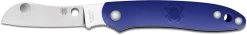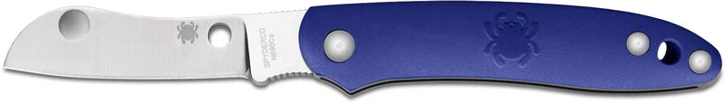 The illustrated Spyderco Knife is the Spyderco Roadie Knife that features a 2.09″ non locking sheepfoot blade made of N690Co stainless steel, .112″ thick. The blade of this Spyderco knife has a flat grind, a notched choil and spine for secure grip, and Double Dent feature for easy two hand opening. The smooth blue (FRN) fiberglass reinforced nylon handle, 2.99″ closed, has Spyderco Bug detailing and a lanyard hole. The Spyderco Roadie Knife has an overall open length of 5.08″, and it weighs 1 ounce. Made in Italy.